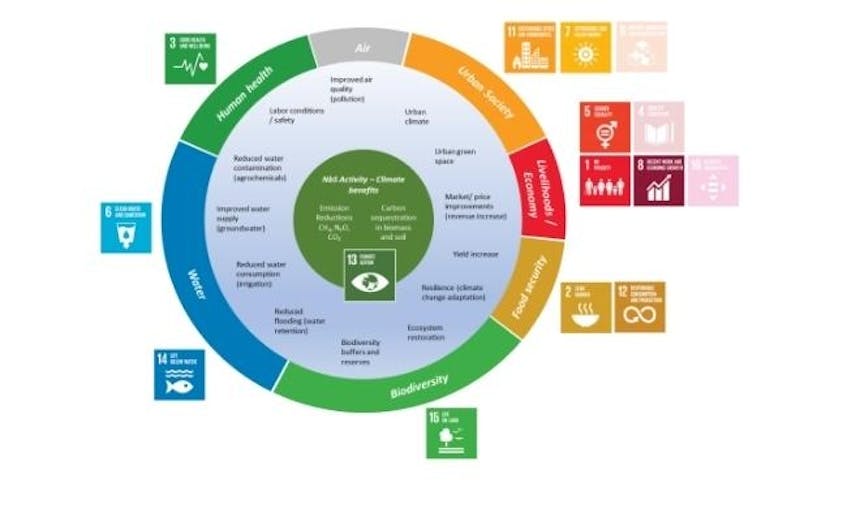Actions by companies and other organizations (and by individuals) to mitigate greenhouse gas emissions including CO2 should ideally follow a hierarchy that starts with avoidance in the first place and then moves on through reduction, substitution, and sequestration if possible. However, where further emissions mitigation is not practicable, or where actions will take time to implement, or in the case of some emissions-regulated ‘compliance’ industries, then the use of carbon credit offsets can play a vital role in avoiding, reducing and removing GHGs. In both the compliance and voluntary carbon markets (VCM), projects are either technology-based, for example renewables, direct air capture or clean cook stoves, or they are nature-based solutions (NbS), for example afforestation, reforestation, or mangrove restoration. In addition to the primary objective of carbon mitigation, NbS projects can also deliver UN Sustainable Development Goal (SDG) co-benefits such as food security, sustainable livelihoods and, of course, restored or safeguarded biodiversity (see Fig 2.). In the VCM, as of June 2022 different VCM credits have been trading for between $5 and $18 per ton of CO₂e (carbon dioxide or GHG equivalent) with high-quality NbS credits priced at the top end⁹. Of these, NbS credits with biodiversity co-benefits represent the highest volume of offsets sold and fetch premiums relative to offsets without them¹⁰.
